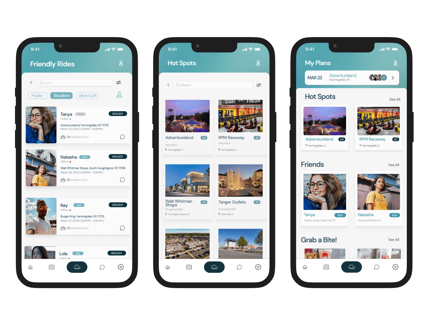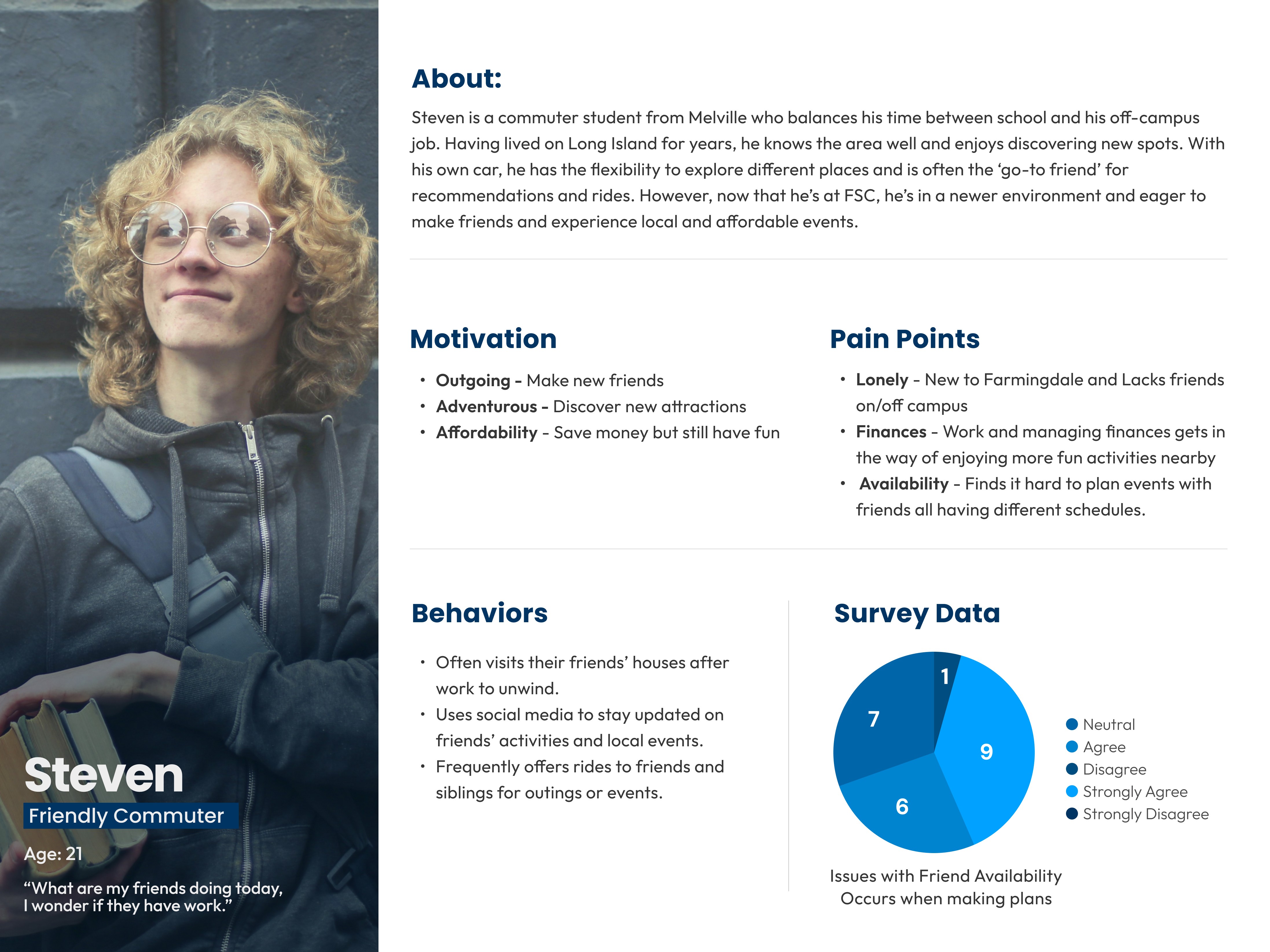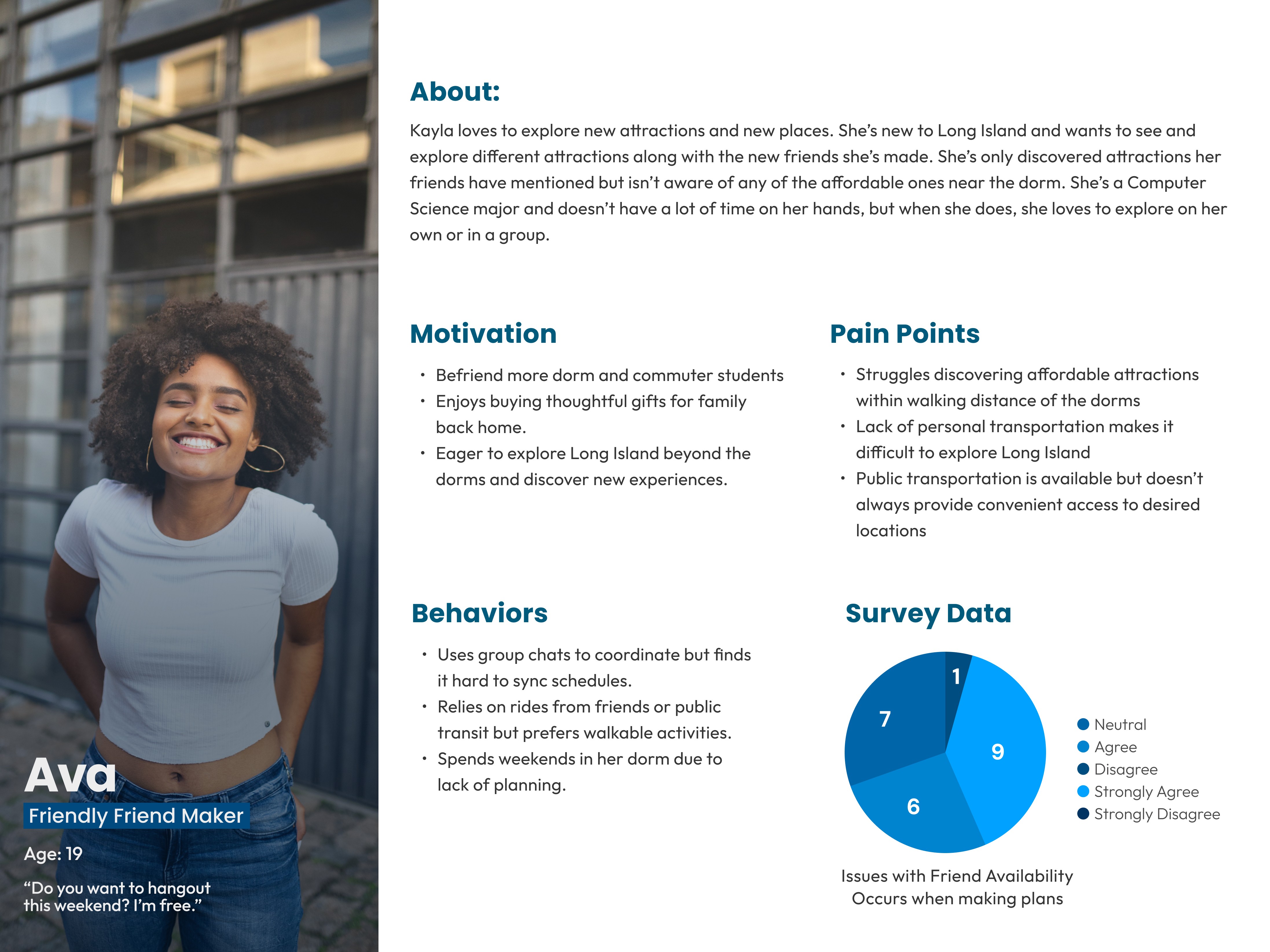 Jake and I set out to create a solution that would help college students and their friends discover affordable attractions and connect with one another, while on a budget. Through our research we discovered that students at Farmingdale State College on Long Island are often unaware of affordable attractions nearby. While commuter students are more familiar with local options, many dorm students were less informed. We also discovered a lack of connection between commuter and dorm students, limiting opportunities to create meaningful relationships.