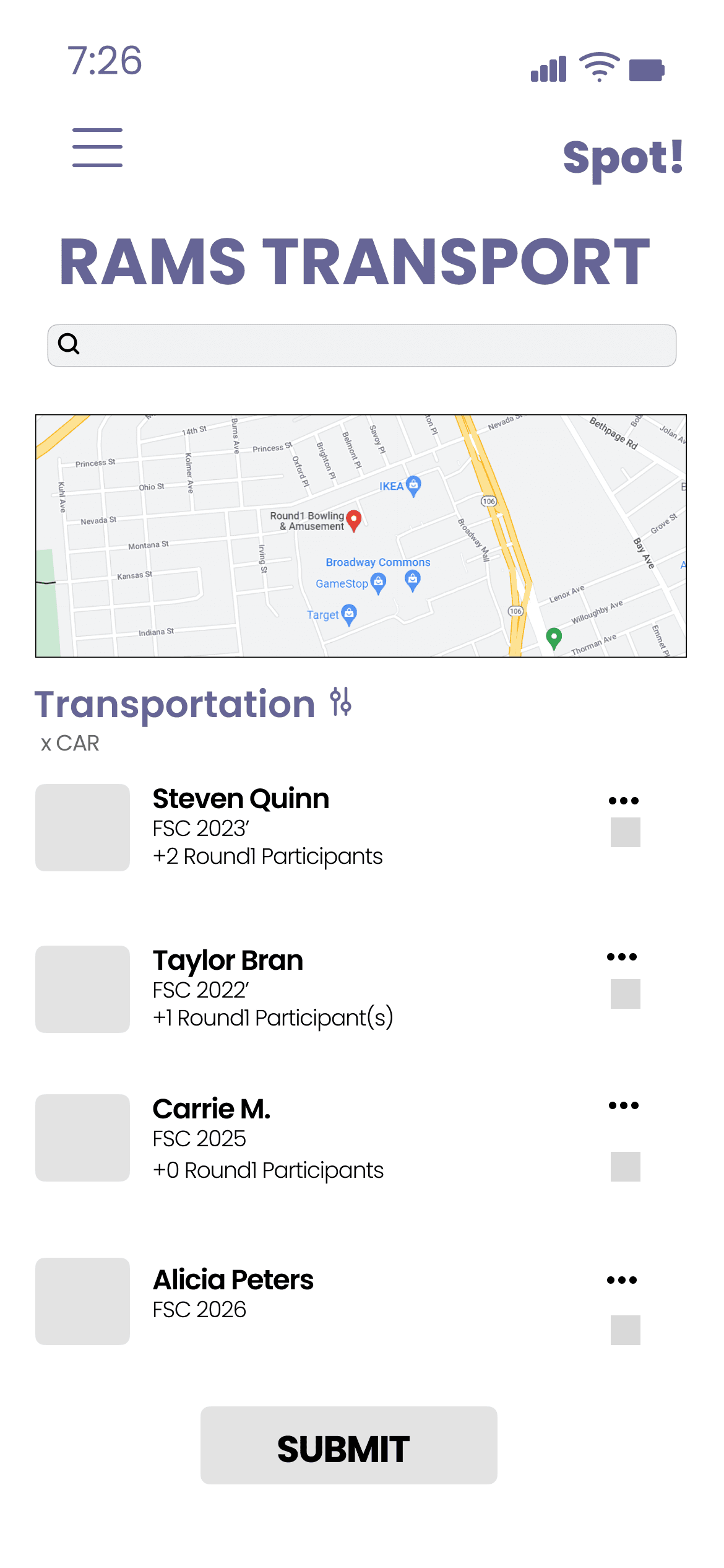 Requesting a ride in Spot! is one of our key features the application provides. Users that attend Farmingdale State College can request rides from students going to attractions they're attending and are interested in.