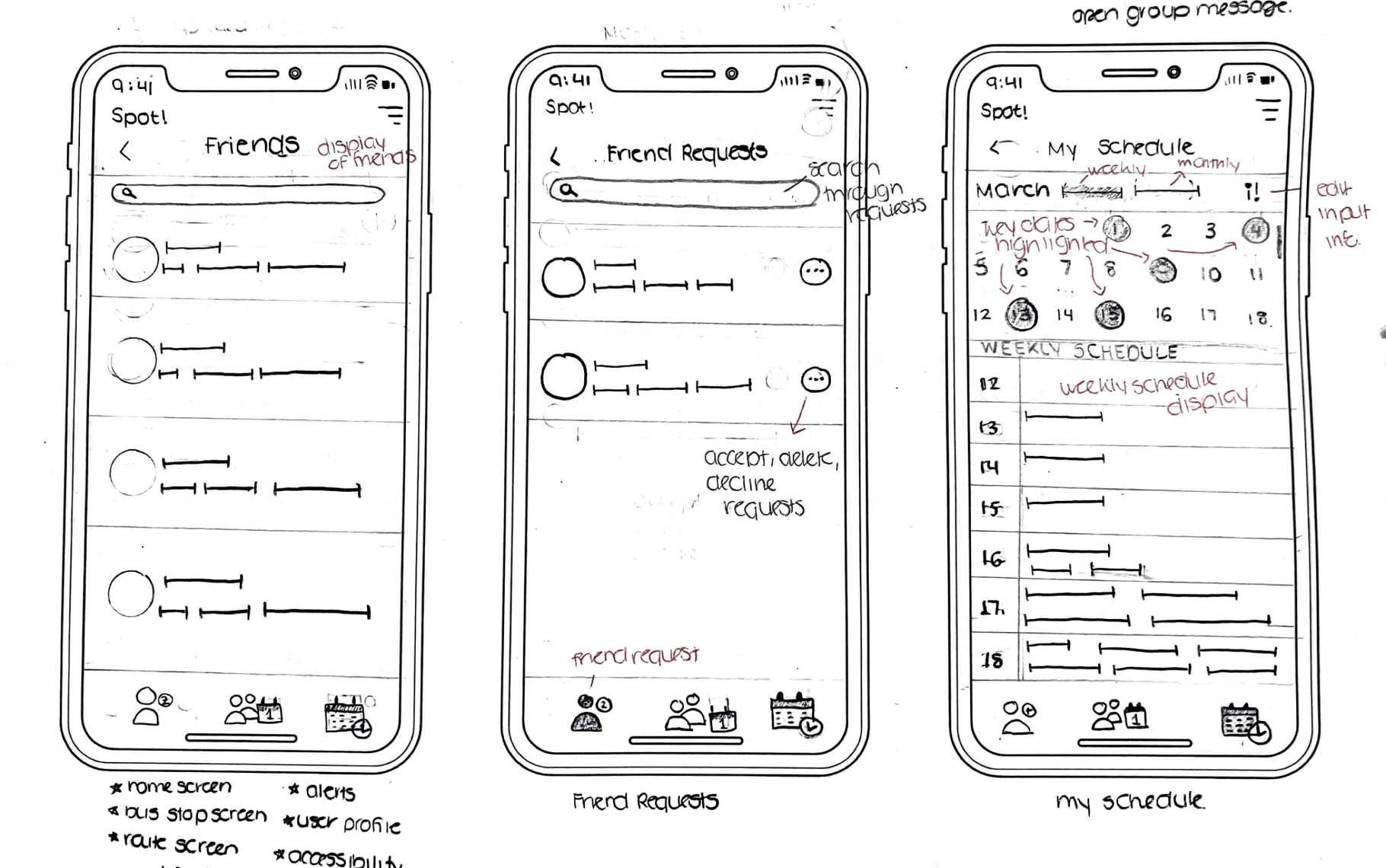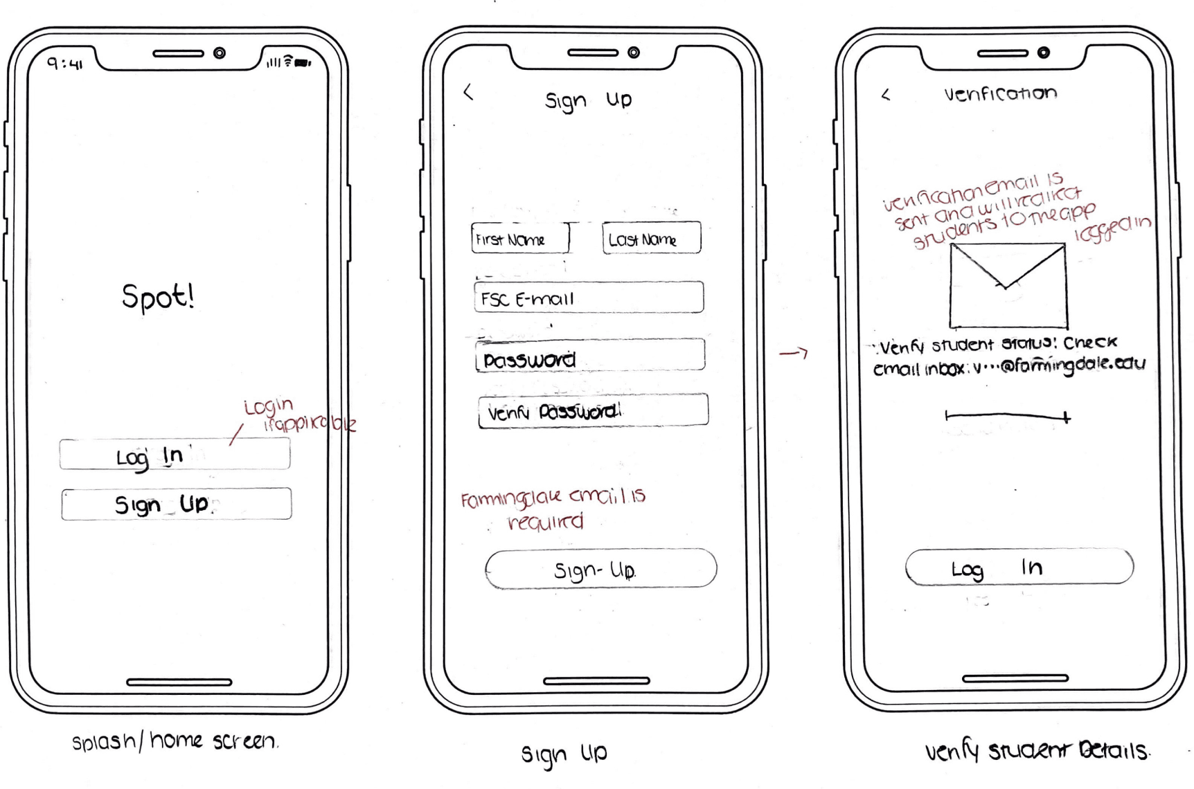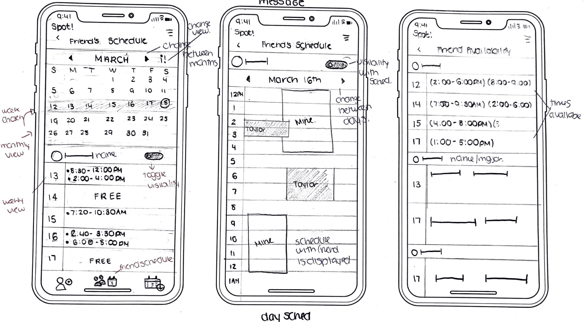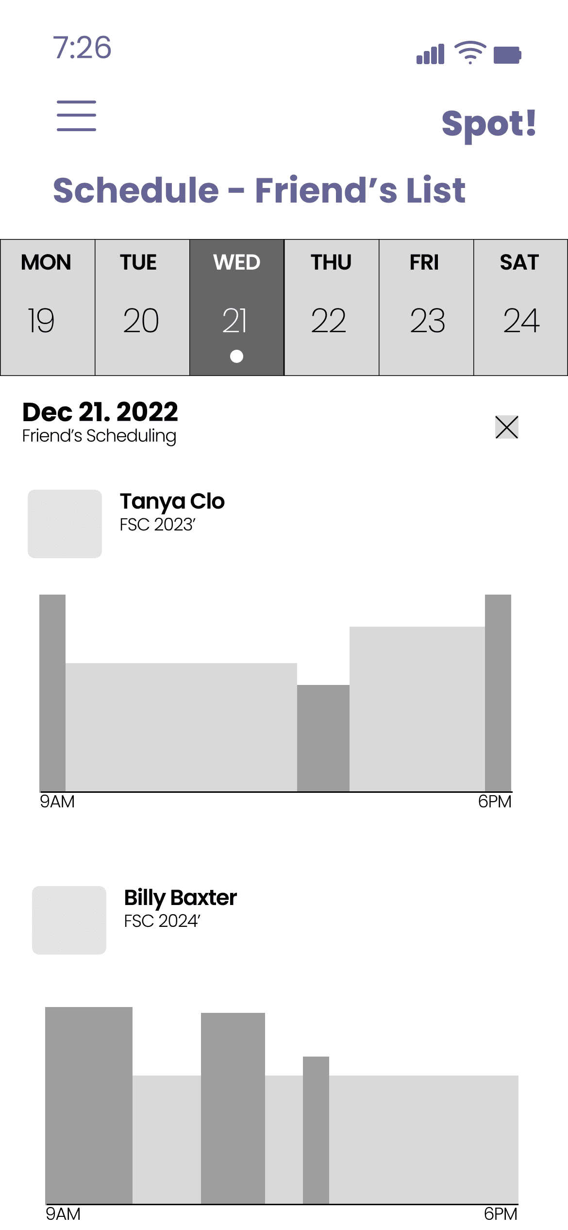 The main focus of Spot! is to connect college students based on their schedules and interests. The mobile app allows users to input their class schedules and extracurricular activities and then find friends who have similar free time. Users can plan outings and adventures with their friends and coordinate transportation to events.