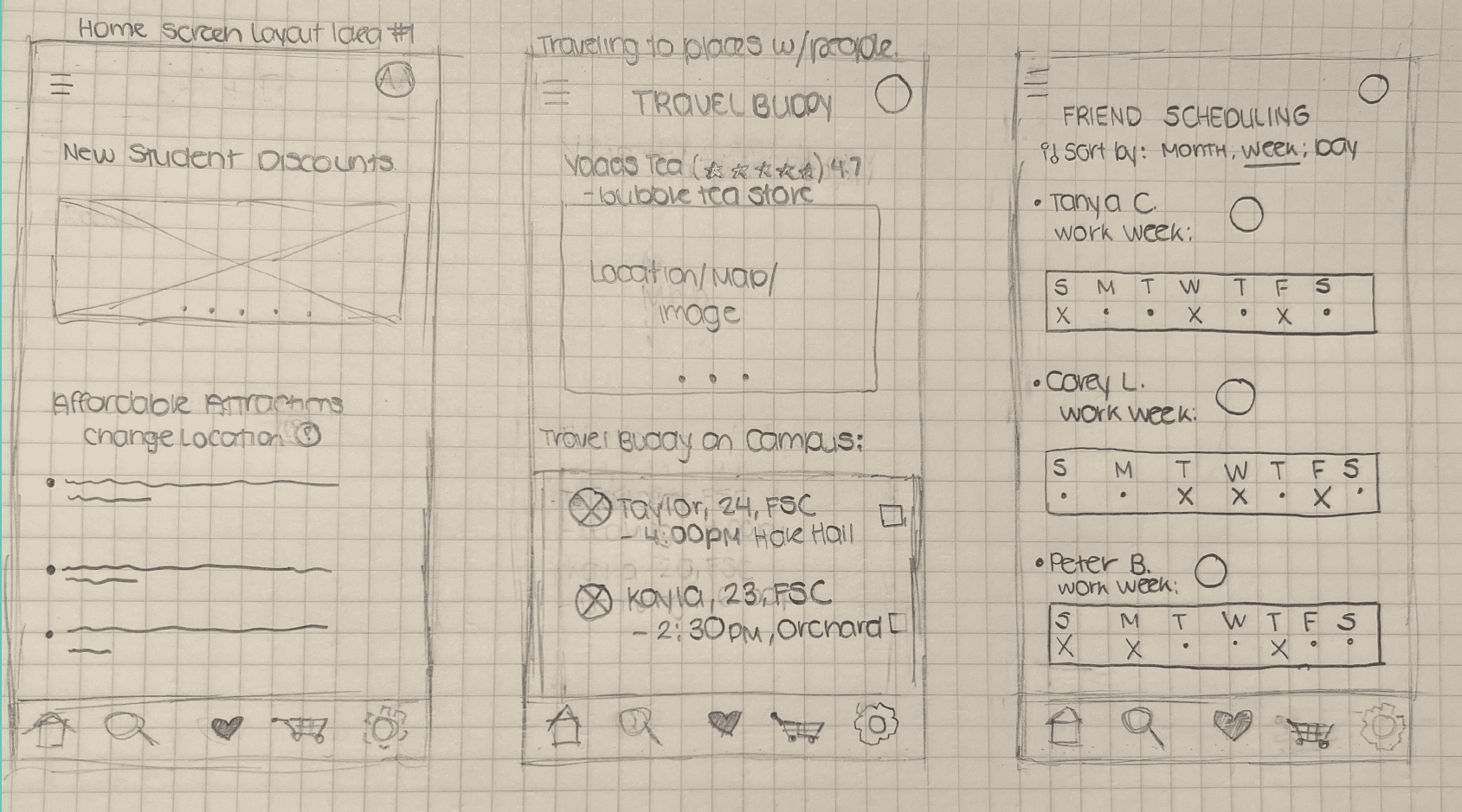 Before moving on to high-fidelity designs, Jake and I created various sketches to explore different user experiences within Spot. Below are sketches for key screens, including Sign-In, Viewing Calendars, Friend Requests, Profile, and Home Screens.