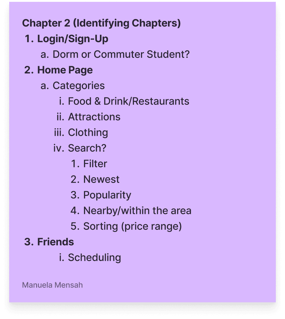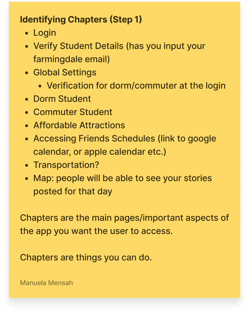 During this portion of the project we both created our own chapters to showcase different experiences for dorm students and commuters. As stated before I focused on how dorm students would utilize this application.