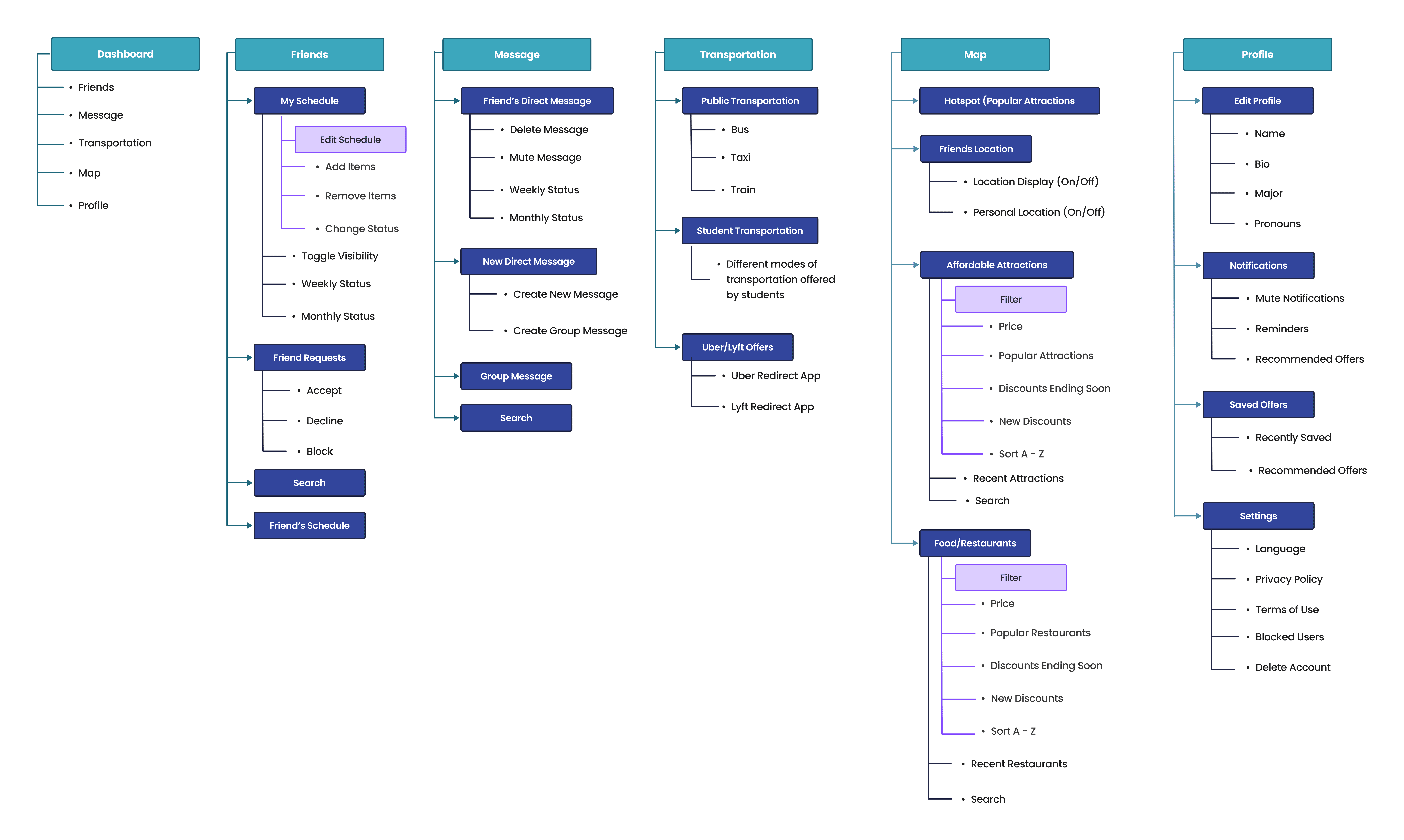 The information architecture showcased the most important and visible sections within the dashboard and the features a user would come across when utilizing the application. They're able to access different modes of transportation, access the map to see hotspot features and even a calendar to view their friends schedules.